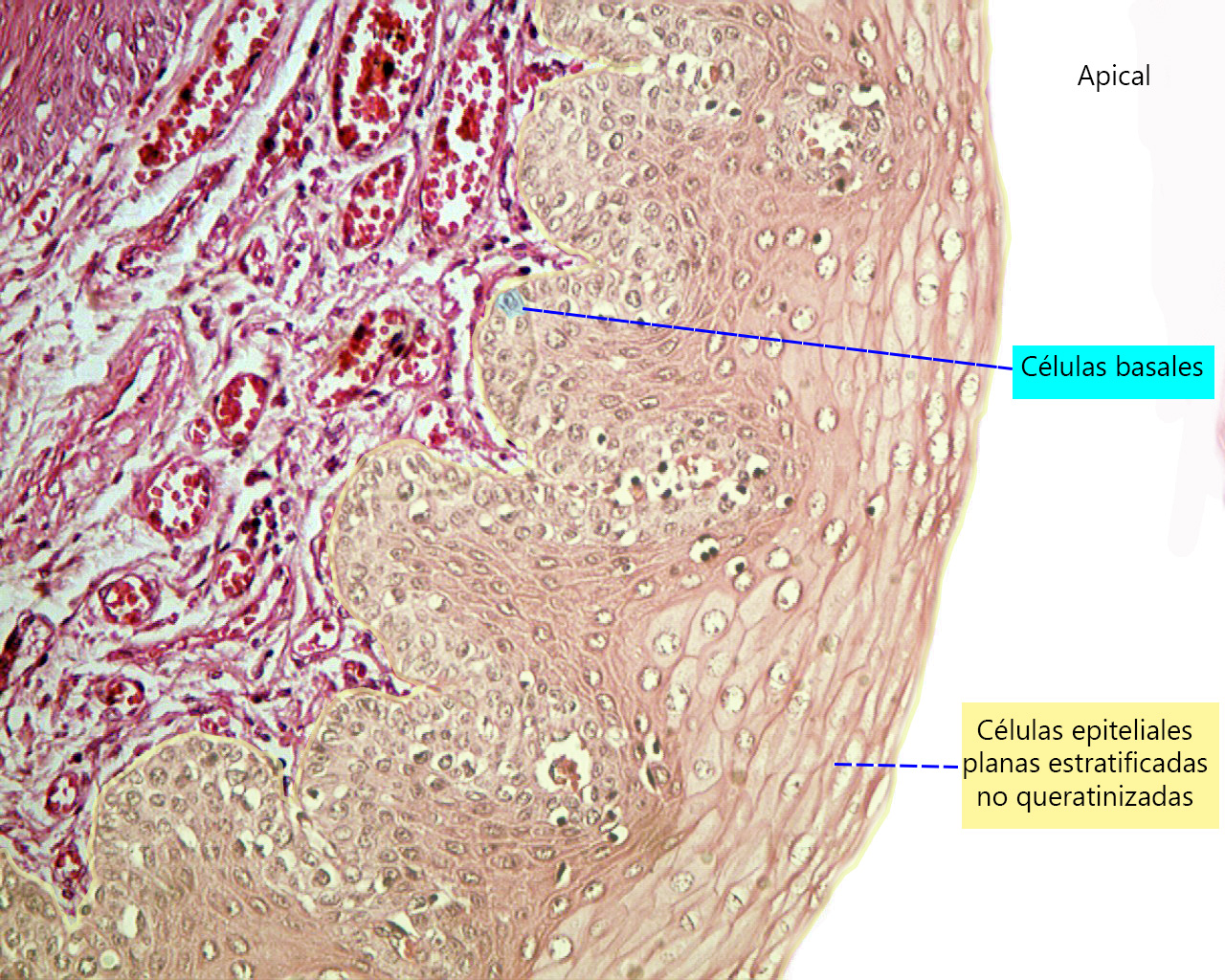 La principal característica de este epitelio, es que posee varias capas de células que se van aplanando y perdiendo sus núcleos y otros orgánulos a medida que se aproximan a la región apical. En la región basal encontramos células en forma de cubo, más pequeñas y son las células basales, quienes se adhieren a la membrana basal que es un poco más delgada en su espesor y que separa el epitelio de un tejido conjuntivo laxo o areolar.